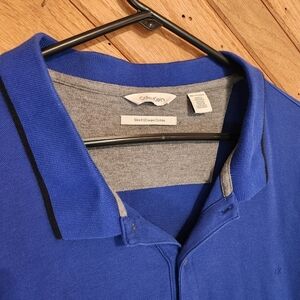 Calvin Klein Slim Fit XXL blue polo. This has a faint white mark on the back that isn't super noticeable. It actually looks brighter in the photos than in person. Otherwise great condition!