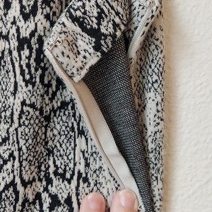 Calvin Klein Snake Skin Print Sleeveless Shawl Collared Thick Sheath Dress. This cool edgy dress didn't have a size tag. My best guess would be around 12 to 14. The model is a 4 for reference. Just picture black leather jacket and some black boots and you have a great date night outfit or maybe a concert! Approximate measurements are as follows: Bust 40", Waist 36", Hips 44" and Length 43". Side zipper.
