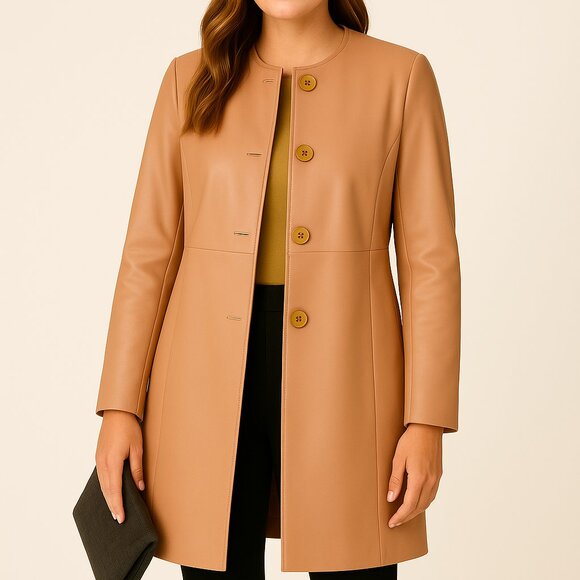 Elegant longline Calvin Klein coat in a soft coral/rose hue. Clean, minimalist silhouette with a round collar, statement buttons, and smooth lining. Perfect for work, dinners, or elevating a simple outfit. Lightweight but structured—great as a transitional coat.