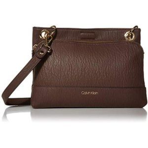 Textured faux leather gives an updated feel to this organized essential. Grab hold of this coveted Calvin Klein crossbody and you won't want to look back. Small sized bag; 11"W x 8"H x 3"D (width is measured across the bottom of handbag); 1.5 lbs. approx. weight Silhouette is based off 5'9" model 23"L adjustableand removable strap Zip closure Gold-tone exterior hardware & 1 zip pocket 2 interior slip pockets & 1 zip pocket Fits iPhone XS Max or smaller model Faux leather Imported