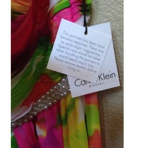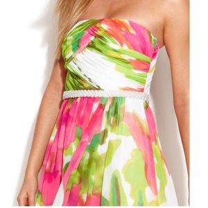 Calvin Klein's sweet gown flaunts a watercolor-inspired floral print anchored with a pearl-trimmed waist. A floaty chiffon hem completes this masterpiece. Soft poly fabric; Hidden back zipper with hook-and-eye closure. Strapless; cups and grip tape at bust. Ruched at bodice; pearlescent beads at front waist. Allover floral print. Pleats at skirt with cascade ruffle at front. A-line silhouette. Lined. Floor length. Perfect formal special occasion dress. BRAND NEW WITH TAGS, SIZE 6.