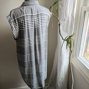 Right on trend! Calvin Klein Jeans shirtdress combines an effortlessly polished look with comfort! The grey, stripes are perfect with creamy linen color. Button down front with a sleeveless arm and hi-low hem. Pair with your favorite bold belt and messy top knot bun!