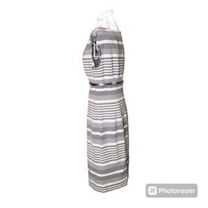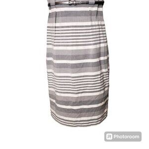 This striped sheath dress with bateau neckline features belted waist and princess seaming Color in shades of grey and off white Hits just above knee and has hidden back zipper Fully Lined 100% Polyester Dry Clean only Size 10 Length 38.5" Underarm to Underarm 18" across flat lay Excellent pre-owned condition Make me an offer!! SS