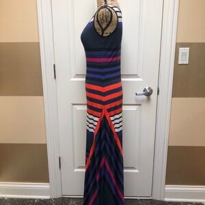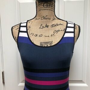 Vibrant orange, deep navy, purple, white, black and fuchsia stripes with contrasting stripes only on one side (see photos).