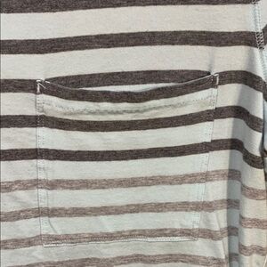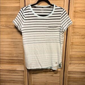Casual striped short sleeve t-shirt in light blue and gray. Features a front pocket.