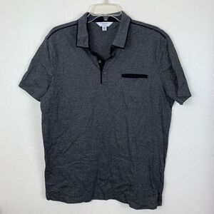 Very nice 100% Cotton grey and black polo with subtle pattern and faux pocket. Great detailing! In excellent condition, the stitching on the front faux pocket is coming undone. If you remove it completely I believe it’s a real pocket.