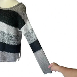 Woman Women Trends Trendy Trending Style Fashion Spring Fall Winter Transitional Comfy Stylish Calvin Klein Stripes Cable Knit Pullover Oversized Sweater Crew Neck Casual Sporty Outdoors Comfy Cozy Metallic Threads Travel Vacation Stretches Black Gray Side Slit