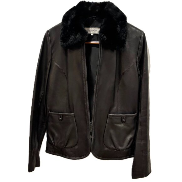 Calvin Klein Stylish Black Leather Jacket Short Coat Fur Collar Womens Small