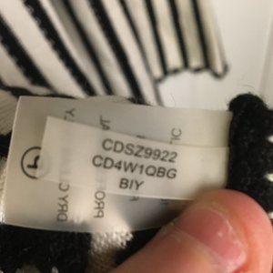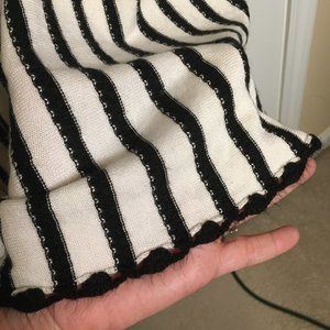 Calvin Klein Sweater Dress Fit and Flare Size in black and white stripe. Crochet trim at hem and sleeves, midi length below knees. Previously owned, no flaws.