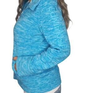 Good condition bright blue colored with embroidered "Calvin Klein" detail on the sleeve sweater in a women large. Color most accurate in modeled photos. Very soft similar to a fleece feeling. Full zip with hood, pockets, smartphone pocket as well as headphone holes built in. No stains, one small hole on the back side underneath the hood shown in photos, not visible when hood is down.