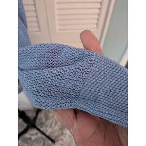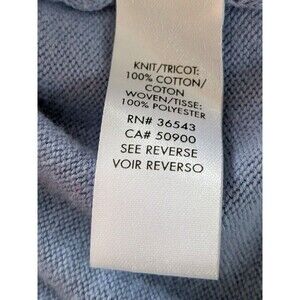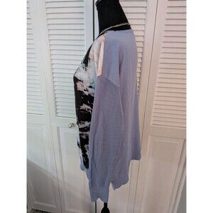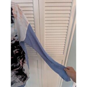 Elevate your wardrobe with this beautiful Calvin Klein sweater. The pullover style features a scoop neckline and long sleeves with waffle-knit fabric and crochet accents. The abstract art pattern in periwinkle blue, white, black, and pink hues will add a touch of classic elegance to any outfit, whether for travel or casual occasions.