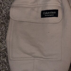 Tan Calvin Klein sweatpants. Size large but fit me well and I am a medium