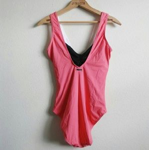 Colorblock one piece swimsuit with a tie front and printed padded bra.