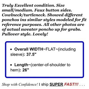 Truly Excellent condition. Size small/medium. Faux button sides. Cowlneck/turtleneck. Showed different ponchos ins similar styles modeled for fit reference purposes. All other photos are of actual sweater poncho up for grabs. Pullover style. Lovely!