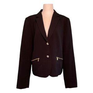Calvin Klein Black Knit Two Button Blazer with Two Front Zippered Pockets in a Structured Tailored Fit.