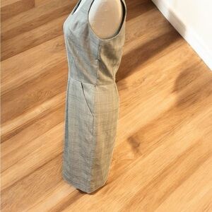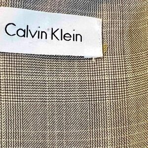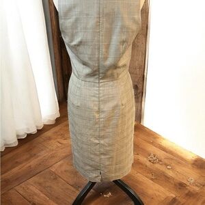 Elevate your work wardrobe with this Calvin Klein sheath dress, showcasing a refined tan and cream color scheme. The sleeveless design and square neckline offer a contemporary flair, while the midi length ensures a sophisticated silhouette for any professional setting. PTP 18 1/2 Length 39