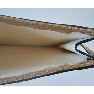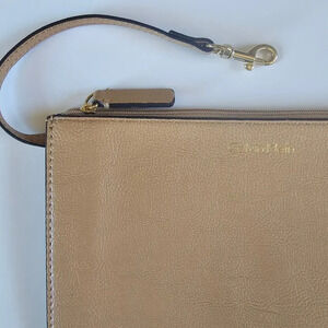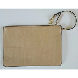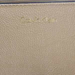 Simple Calvin Klein zipper bag with hook attachment strap. Expands a little on sides, not on bottom. Like new except for light pen mark inside in one place (as pictured).