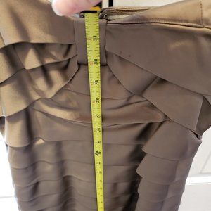 Heavy weight strapless dress. Glossy/shiny type Taupe material. Has a bit of stretch to the dress. Knee length. There are actually straps on the dress but they can be removed. Pretty good used condition. I found a few small snags when I was taking photos for this listing. I added photos but not sure they show properly.