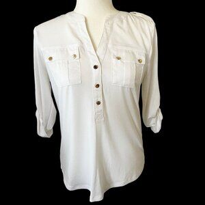 This Calvin Klein blouse features roll-tab sleeves and comfortable textured fabric with metallic gold buttons. Made of 95% polyester, 5% spandex, new size XS measures 24" long, underarm to underarm 20" (LL4067)