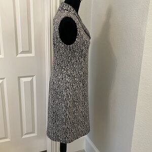 Calvin Klein Heavy Knit Sheath Sleeveless Dress Roll Collar Side Zip Sz 8. First let me say that I LOVE THIS DRESS and wish it still fit me. Beautiful flattering fit. Year round wear. Unlined. Thick knit fabric. Side zip to help pull it on. Color is tan and black. Modern print. Says dry clean only, but it washes beautifully in gentle cycle and hang to dry