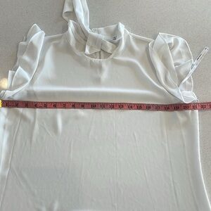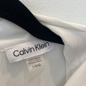 Elevate your wardrobe with this elegant Calvin Klein white blouse in size L. It features a tie-neck detail and ruffled cap sleeves, adding a touch of femininity and sophistication. Perfect for both professional and casual looks. In excellent condition, ready to complement your favorite skirts, trousers, or jeans.
