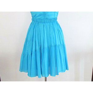 New Designer Calvin Klein Turquoise Rushed Bodice Spaghetti Strap Tier Full Skirt Belted Knee Length Dress