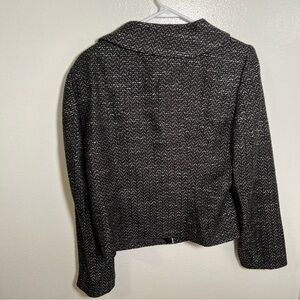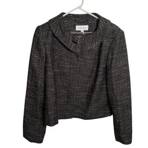 Good condition, may be missing button on collar. Calvin Klein. Blazer. Tweed. Black and silver metallic knit. Hidden buttons. Round collar. Size 14. 56% acrylic, 26% polyester, 18% rayon. Pit to pit laying flat 20” shoulder to hem 21” sleeve (shoulder to hem) 25”. All measurements are approximate and taken lying flat. Smoke free home. No trades, offers welcome.