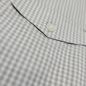 The Calvin Klein Two Pocket Shirt is a stylish and versatile men's button-down shirt in L size, featuring a classic grey and white checked pattern. This short sleeve shirt has a collared neckline and button-front closure, making it suitable for various occasions including casual wear, business meetings, and parties. Made from woven cotton fabric, it is machine washable for easy care.