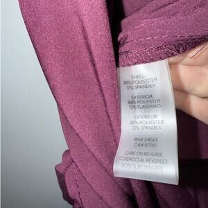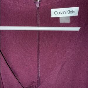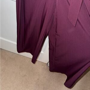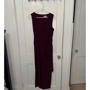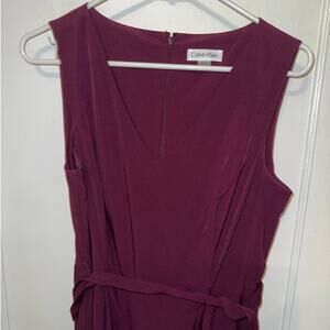 Calvin Klein V-Neck Sleeveless Tie Waist Purple Jumpsuit, in gently used condition, color is purple similar to up close photos, has wrap around tie waist, measurements included, cropped length, zippers down the back, made of polyester and spandex, size 6 womens