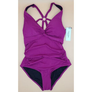 Calvin Klein V-Neckline Shirred Front Strappy Back Ring Sz 10 Boysenberry NWT