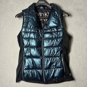 Calvin Klein Vest Womens L Blue Metallic Funnel Neck Puffer Repellent Full Zip Vest