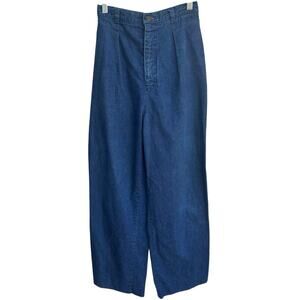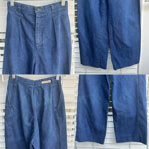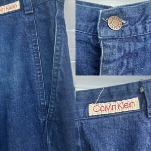 Features: Authentic Calvin Klein denim from the 1980s; medium indigo wash with high rise fit; pleated front detail and wide belt loops; straight-to-wide leg cut with side slant pockets; copper-tone Calvin Klein stamped button; signature red-stitch Calvin Klein label at back waist; hand-altered stitching at inseam and gusset