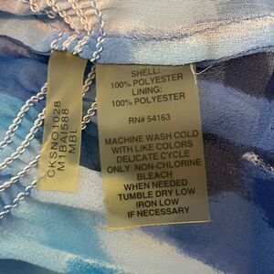 Calvin Klein Watercolor Peplum Blouse in swipes of Blue and White Chiffon. It is Short Sleeve, has a Light Blue Satin Removable Camisole Liner with Adjustable Straps, a Scoop Neck with Elastic Trim all around, a Tie Keyhole in front and is a Pull-Over elastic waist Peplum style. Could be worn it Off The Shoulders too!