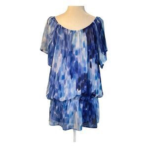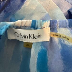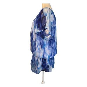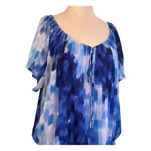 Calvin Klein Watercolor Peplum Blouse Blue White Chiffon Short Sleeve Lined XL