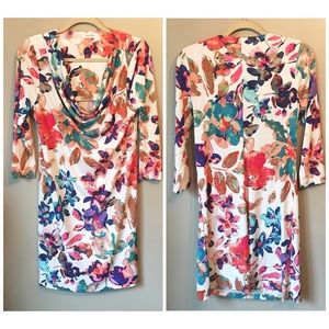 This gorgeous watercolor floral sheath dress by Calvin Klein has never been worn outside of a dressing room! Features an exaggerated cowl neck, which would wear great with a statement necklace. Very comfy, wear it from the office straight out to dinner. Size M, 40" bust, waist goes straight down from bust. 39" length, 19" sleeve. See pic for materials and care. (**necklace not included**)