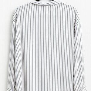 Classic and polished Calvin Klein button-down blouse featuring a crisp white base with thin black vertical stripes for a timeless, elongating look. Designed with a relaxed open collar, full button front, and long sleeves that can be worn cuffed or down for versatile styling.