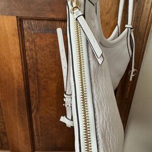 Calvin Klein; Tote; White; Faux Leather; Gabrianna; Expandable; Hidden Magnetic Close; Front: Logo in Gold Stencil; Zip Around Converts to Large Tote; Hidden Removeable Shoulder Strap; Goldtone Logo Hardware; Double Hang Tag w/Goldtone Circle & Logo Bar; Logo Fabric Lining; Back Interior Wall: Zipper Close Pocket w/Faux Leather Trim, Zipper Pull & Logo Patch; Front Interior Wall: Slip Pocket w/Faux Leather Trim; 12"L x 5"W (when unzipped) x 12"H; Handle Drop: 8"; Strap 22" Drop - Adjustable +/- 2"; 100% Man Made Material