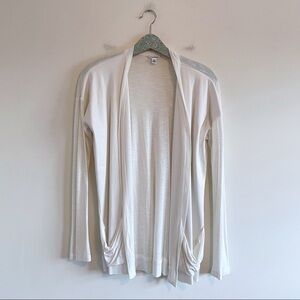 Features: White open cardigan, perforated faux leather front panels, front pockets, closet staple minimalist style