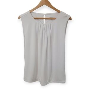 Staple white sleeveless layering top. Looks great with a blazer or a cardigan.