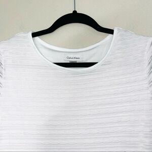 Calvin Klein white textured lined blouse. In excellent condition! Crew neckline. Short sleeves. Straight bottom hemline. Fully lined. Sleeves are slightly sheer. Textured stripes throughout. True white color. Size large.