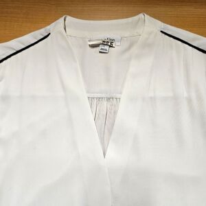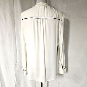 Calvin Klein White with Black Piping Pleated Drape Front Loose Fit Career Blouse