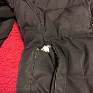 Hooded Winter jacket. Very warm fleece material on the inside. Multiple pockets. Small hole that just needs to be sewn.
