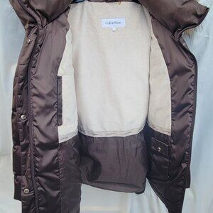 A shimmer brown in color this gently used winter coat is in great condition! It is very warm with a removable zippered faux fur hood & a beige soft plush lining. Has inside pockets as well as outside ones. There are no rips, snags or flaws!