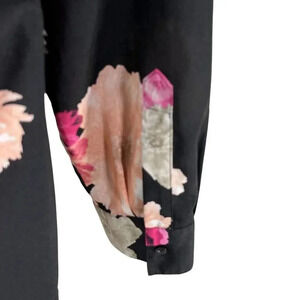 Calvin Klein Women L Black Pink Floral Button-Up Blouse Long Roll Tab Sleeve Top