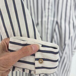The Calvin Klein Women's Striped Shirt Dress in blue ,white, black tie waist is a versatile and stylish addition to any wardrobe. Made of comfortable cotton, this knee-length dress features long sleeves and a collared neckline, making it perfect for both casual and business occasions. With its classic pattern and chic design, this dress is ideal for wearing during the summer, fall, and spring seasons. Showcasing the signature Calvin Klein brand, this dress in size 4 offers a flattering fit and timeless style for the modern woman. Beautifully made with accent buttons on cuffs & collar, hidden button closure & small stitching