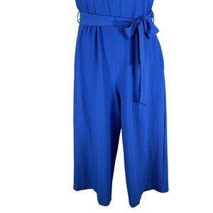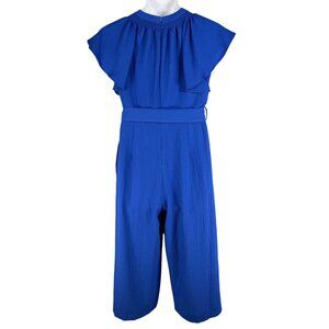 Calvin Klein Womens Size 8 Royal Blue Ruffle Tulip Flutter Sleeve Belted Crop Jumpsuit Wide Leg Crepe Textured Pockets