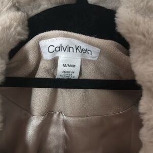 Chic faux fur vest by Calvin Klein. Soft beige color. Ideal for layering. Super soft material. Chic large collar with gold detailing. Front pockets. Perfect condition. Smoke free home.