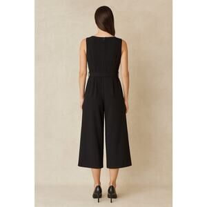 Chic and timeless black sleeveless jumpsuit by Calvin Klein, featuring a flattering V-neckline, waist tie belt, and wide-leg cropped fit that enhances the silhouette with modern sophistication.