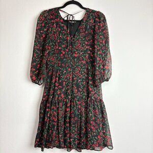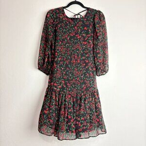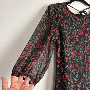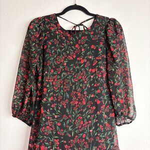 Calvin Klein Women’s Black Red Floral Dress Size 4 • Sheer Sleeves • Ruffle Hem