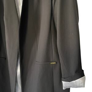 Classic longer length women’s open front blazer by Calvin Klein. 3/4 length sleeves can be cuffed to show contrast lining. Collarless open front, no buttons. Two front pockets. Single vent.